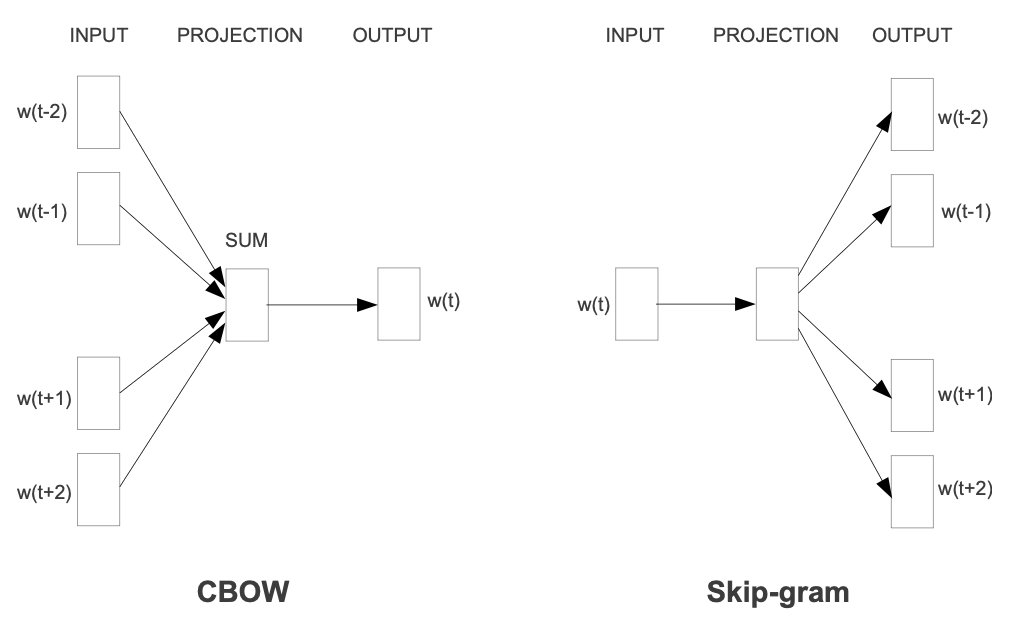 Two architectures are introduced: Continous Bag-of-Words (CBOW) and Continous Skip-gram. The CBOW model predicts a token by projecting the \(N\) preceding and the \(N\) succeeding token into their vector representation then summing them, normalizing the sum, and passing it to a classifier. In their implementation, they used a log-linear classifier with \(N=4\).